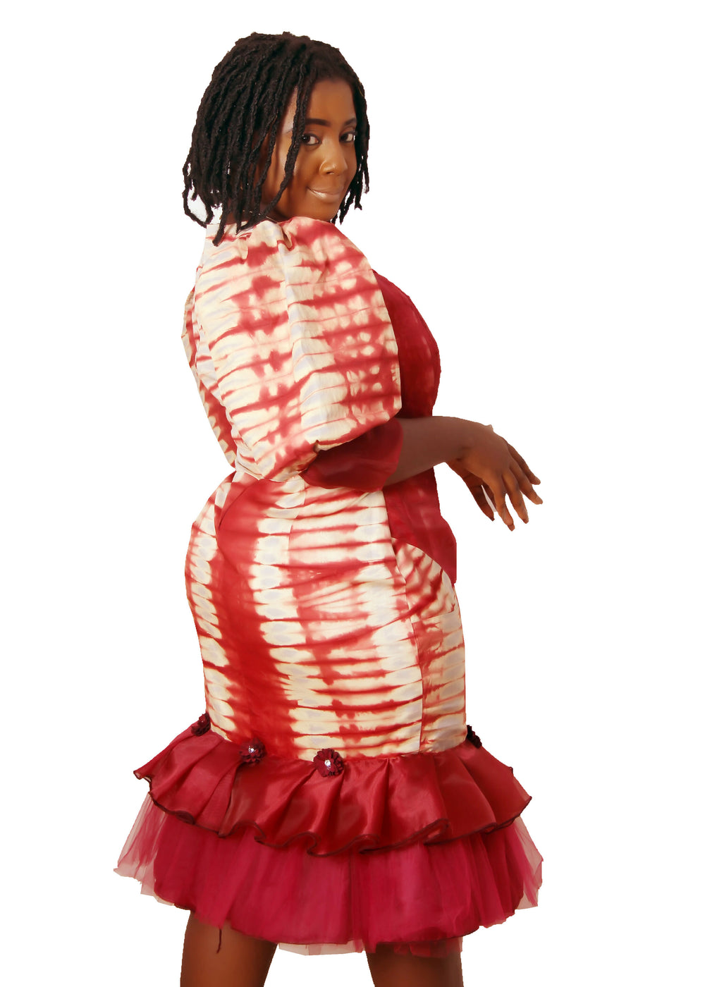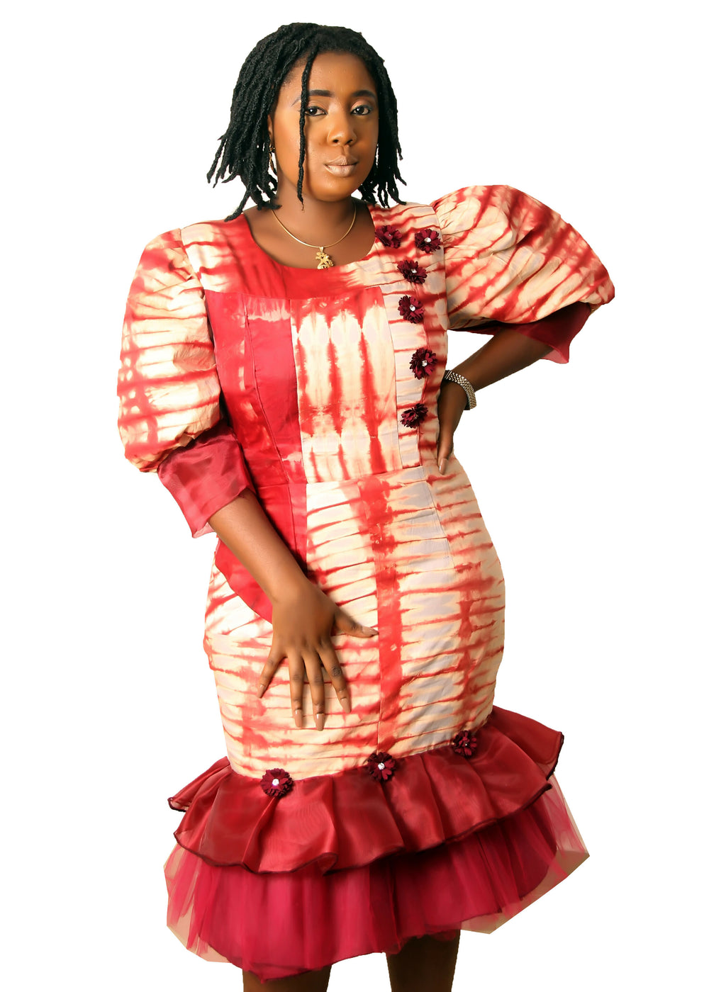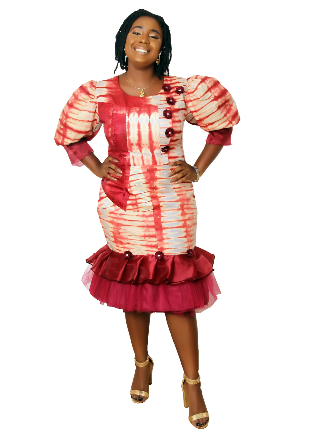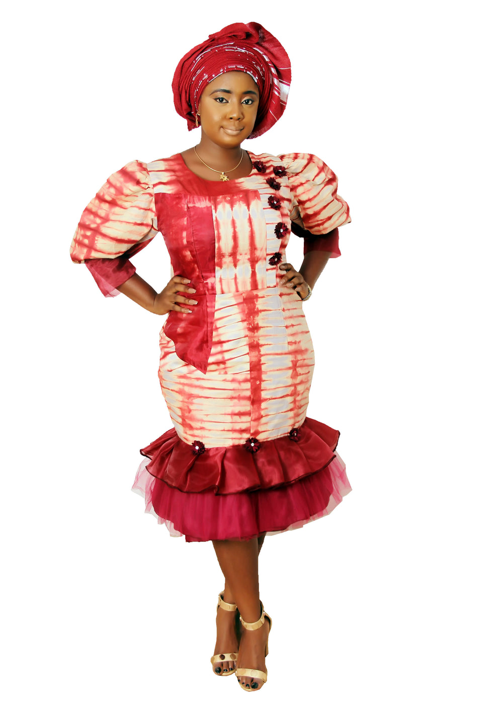 | A beautiful vibrant African attire with modest hemline at a little below knee lenght. It has a Mermaid cut. It has stylish puffy sleeve. It is comfortable and conservative. No matter the African event you are attending shop this dress to be appropriately dressed. Suitable for business, formal meeting, family gathering, prom, church, birthday, African wedding. Its also an African plus size favourite fashion because no spilling out of bust at necklines and no slits. Super comfy for all body sizes. Shop now. Dress only. Asooke Head Gear can be ordered separately |