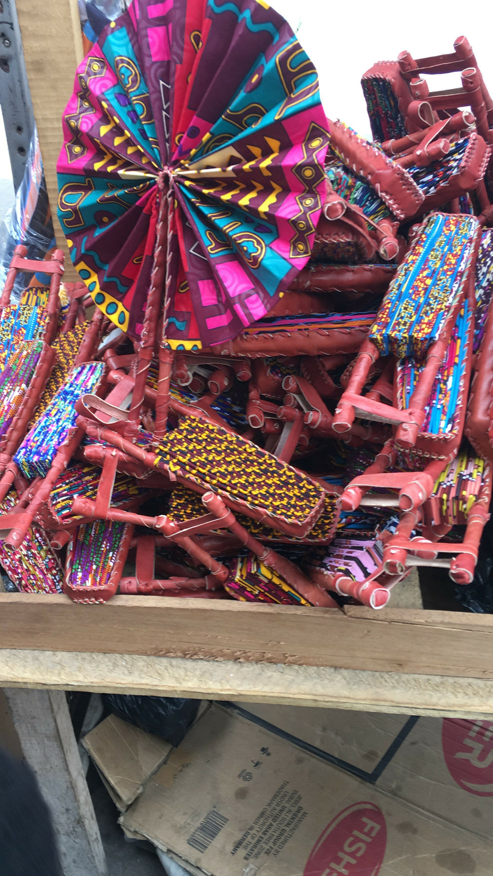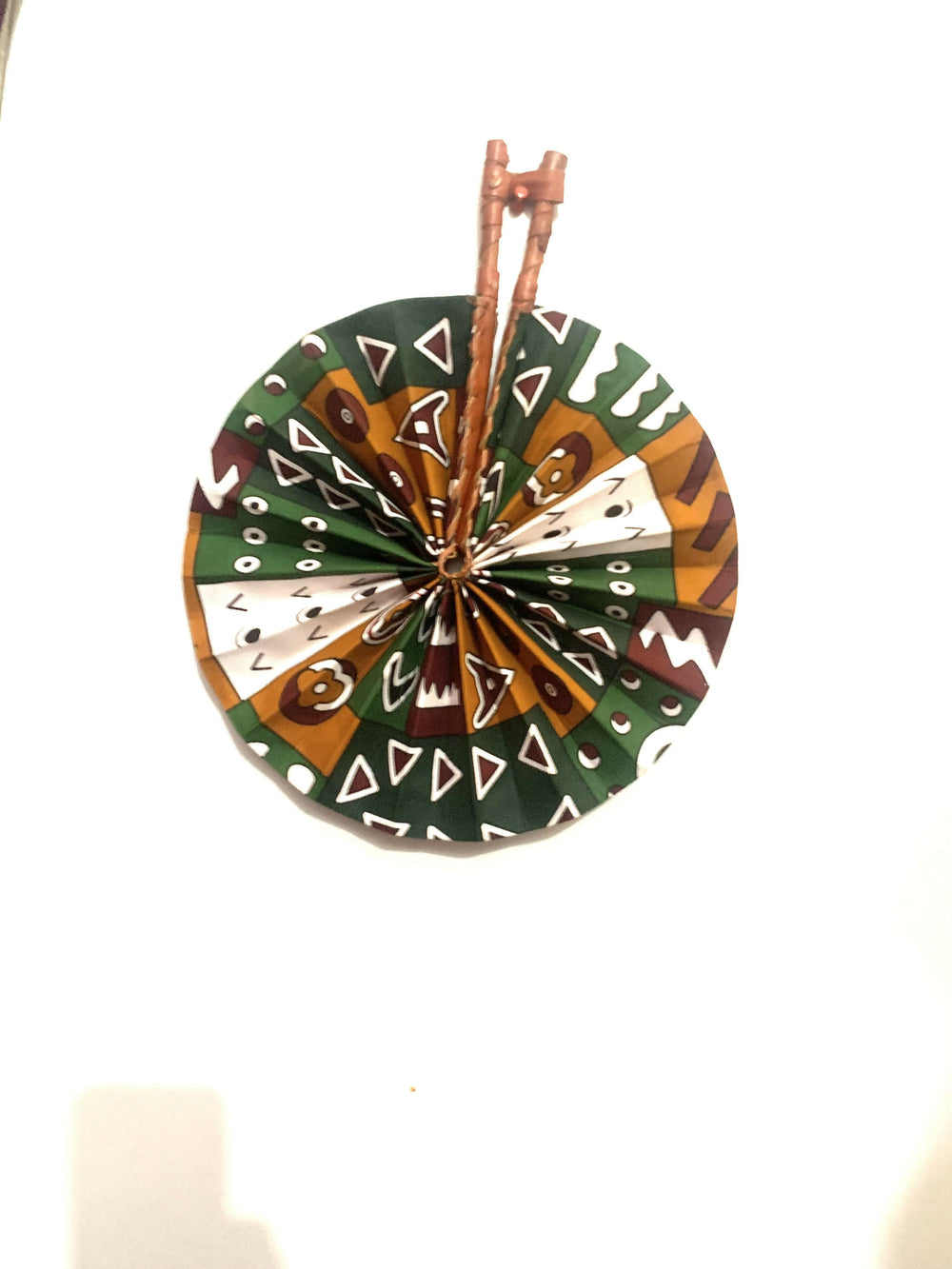 Hand fan made of African fabric and pure leather. Is used for ventilation and room decoration.