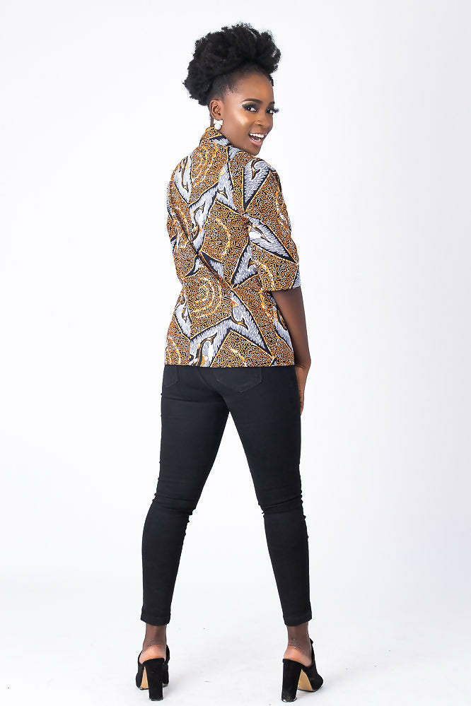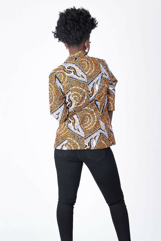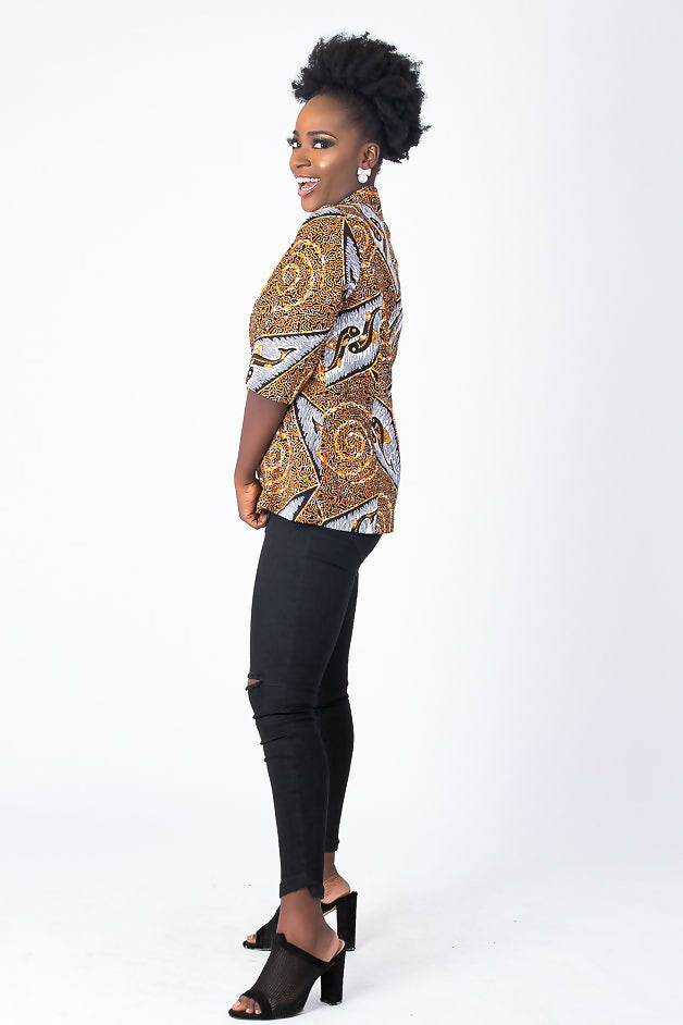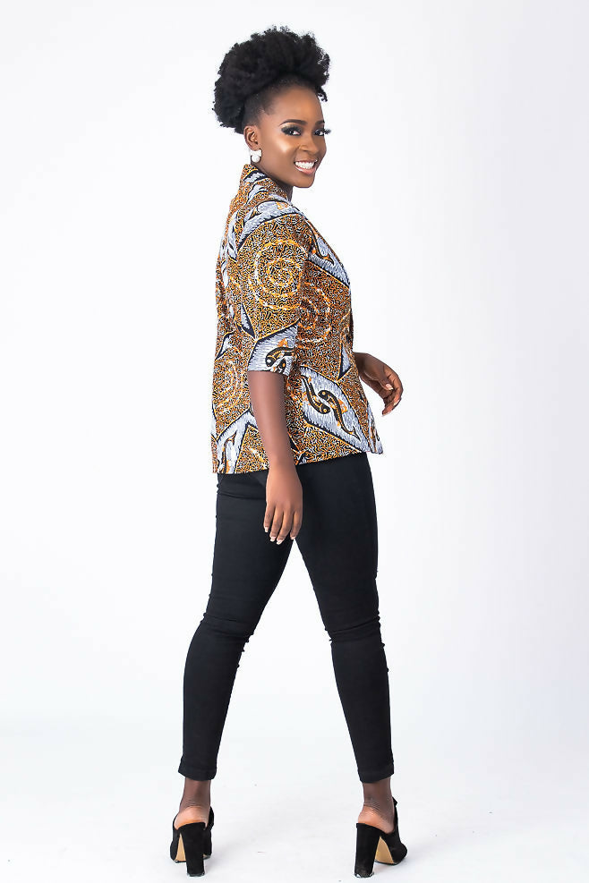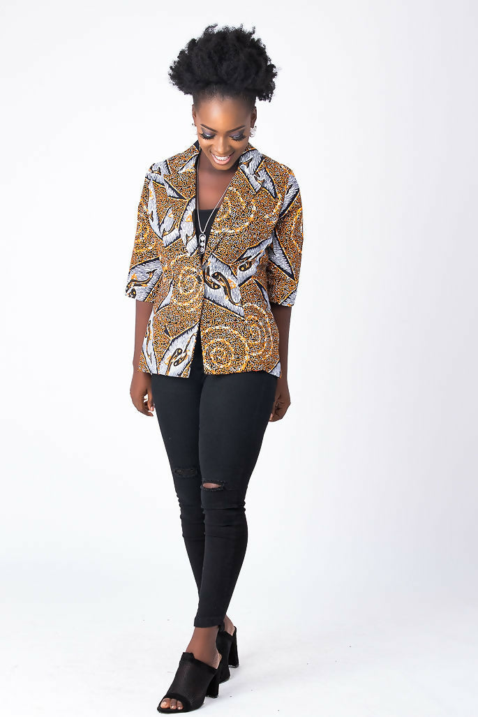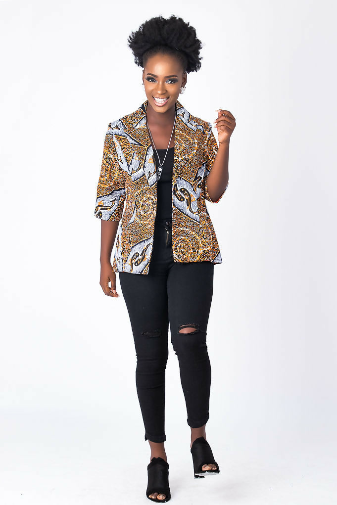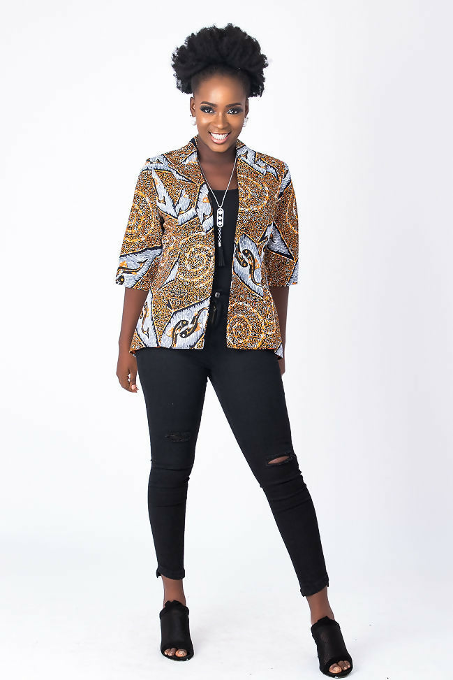 Look classy in our lovely Ladies African Print Jacket. This orange African blazer has three-quarter sleeve that makes it hot and fashionable. It has only one button front closure. It can be worn as corporate or casual. Style with dress, jeans, camisole, skirt as desired.