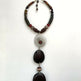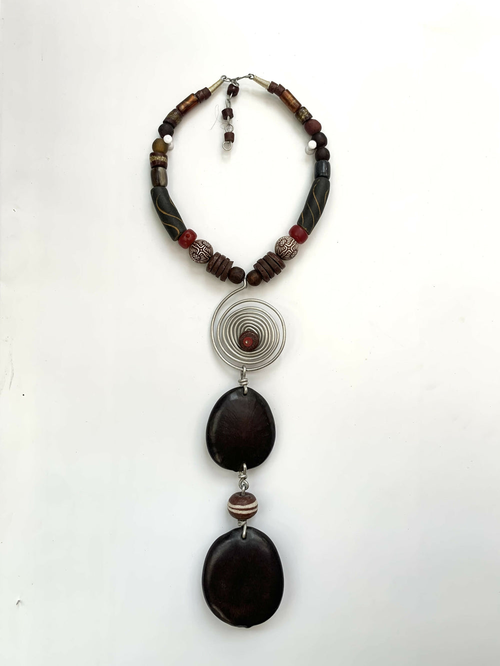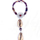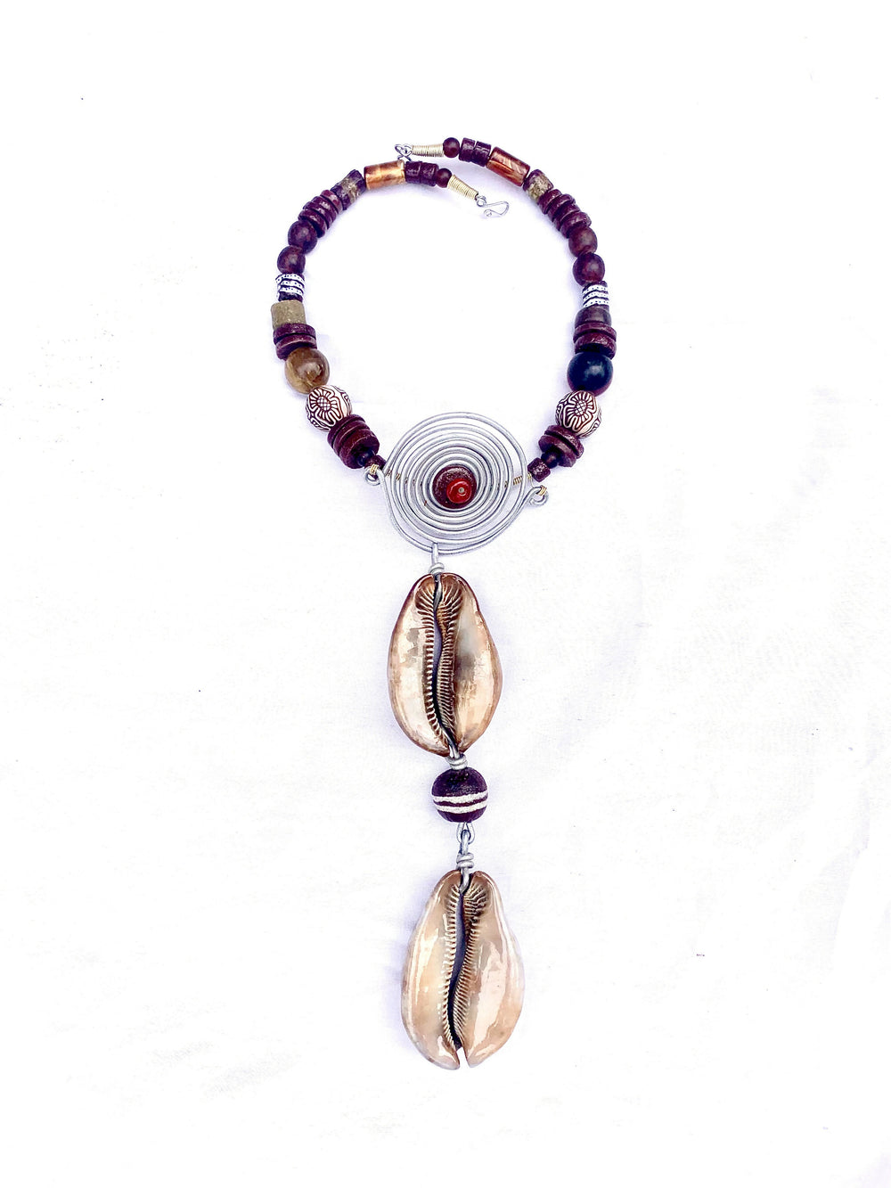 Sankofa crest laliat is made of aluminum wire, healing seeds from the forest and cowrie shells which signify worthy.