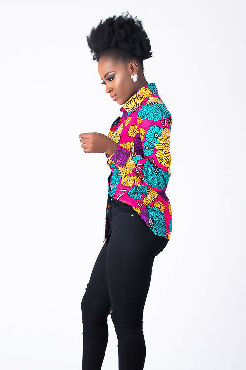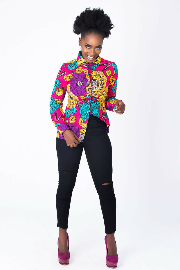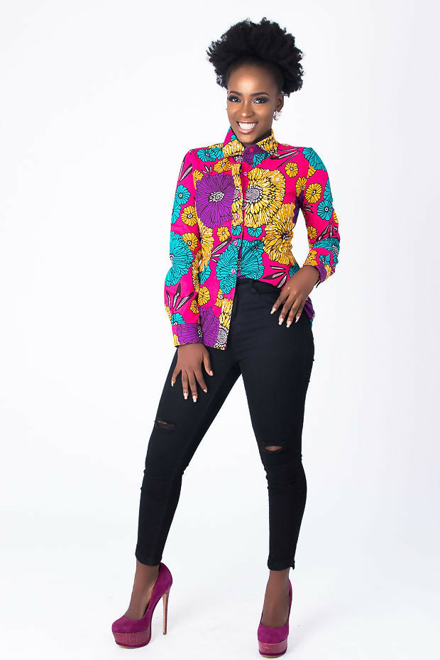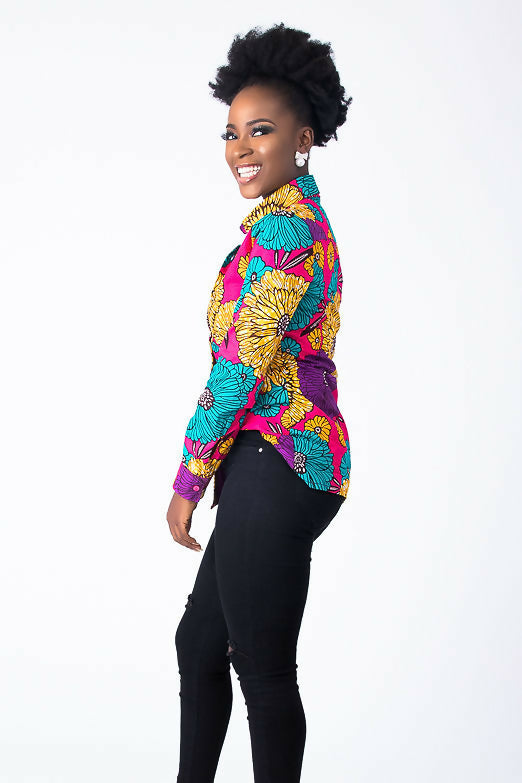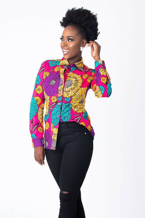 | Connect to the richness of a colourful African culture in this long sleeve african print shirt for women. Perfect Shirt for that formal meeting, weddings, church,office, hangout. It's suitable for the African lady boss fashion style. You can also choose to style as casual outfit as deem fit. You can roll up the long sleeves slight, about three-quarter up for that fashionista feel. This corporate African shirt can be paired with a trouser, skirts, and culottes pant. Furthermore, you can also express your African fashion by tuck in this beautiful African Print shirt and styling with a matching plain scarf around the neck. |