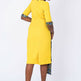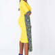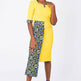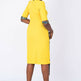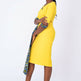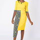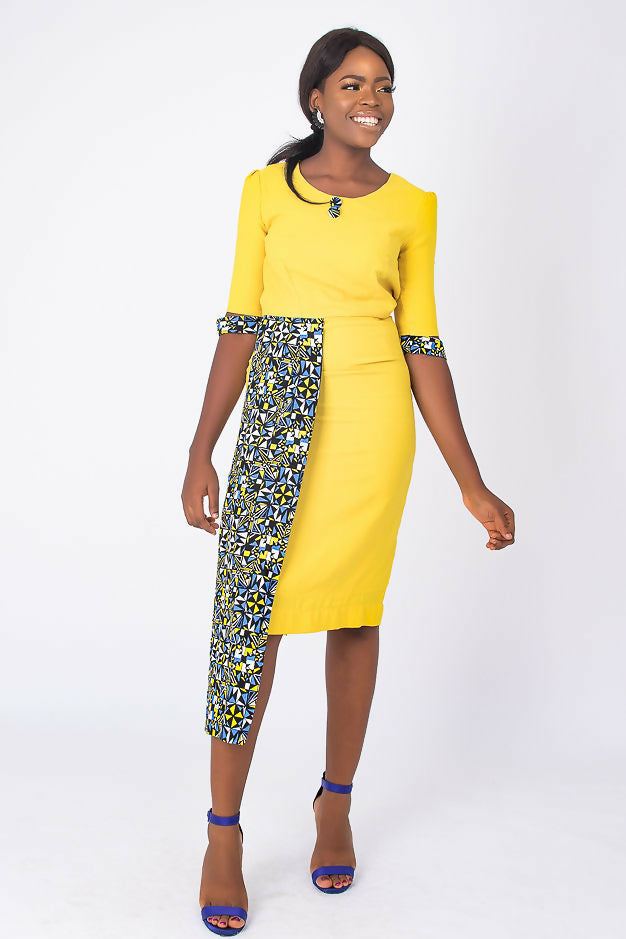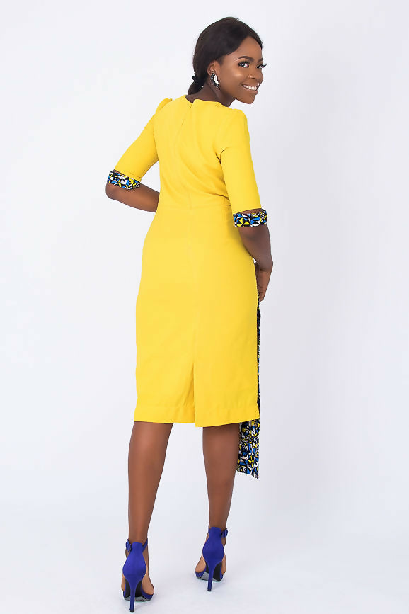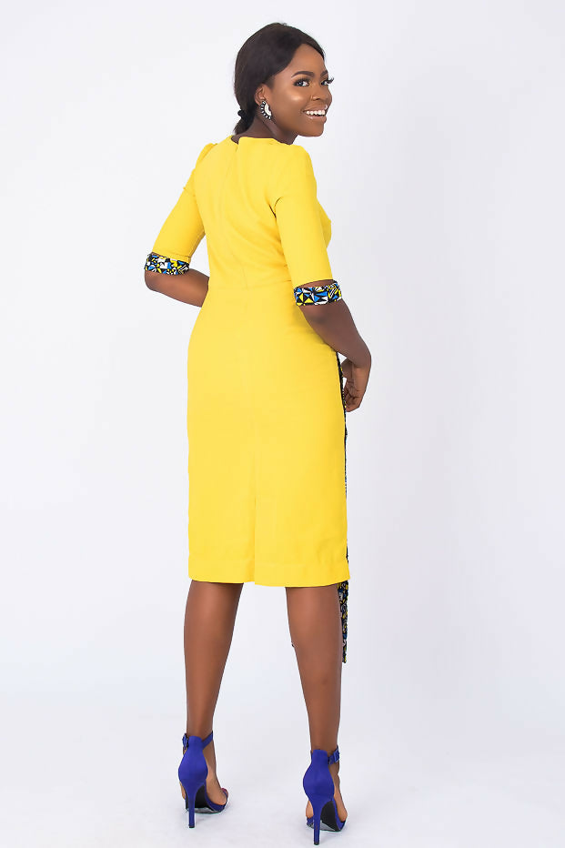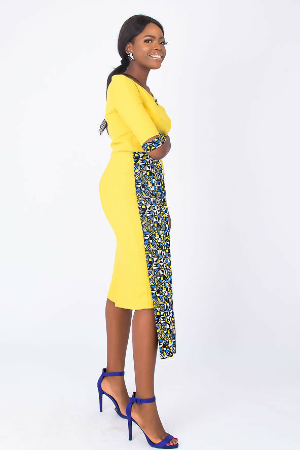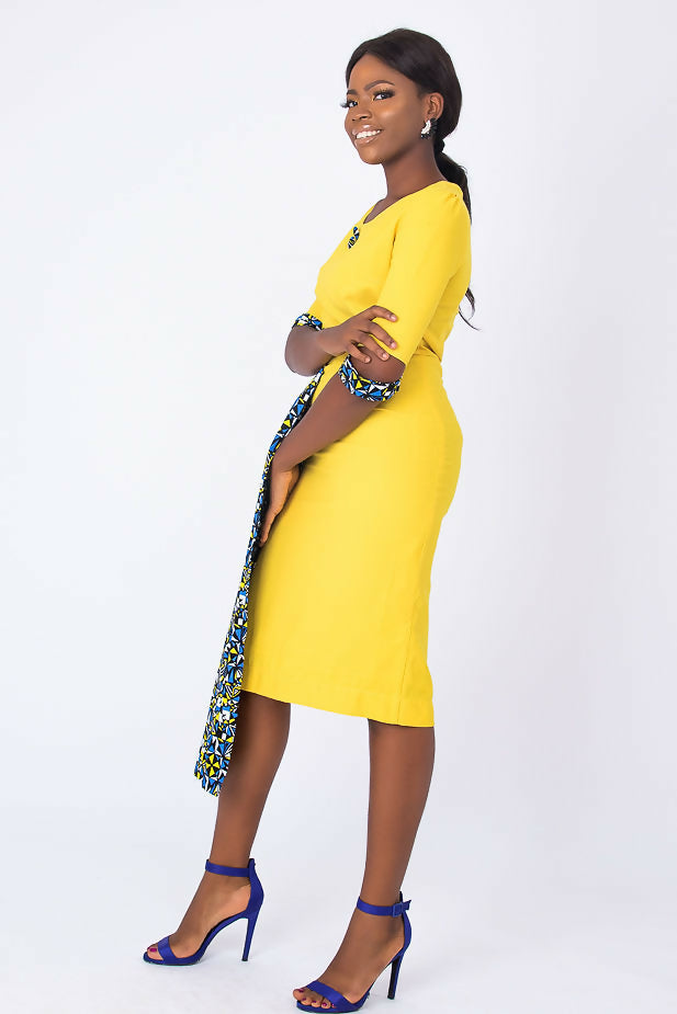 A fully lined -midi-length yellow African dress with a stylish sleeve. It has a blue Ankara African print touch attached to side front waistline for that disrupt fashion statement. It has buttons at center front neck. Has Slit at back for easy movement and a back closure with an invisible zip. Feel comfortable going to work in this essential African formal business style for the lady boss wardrobe.